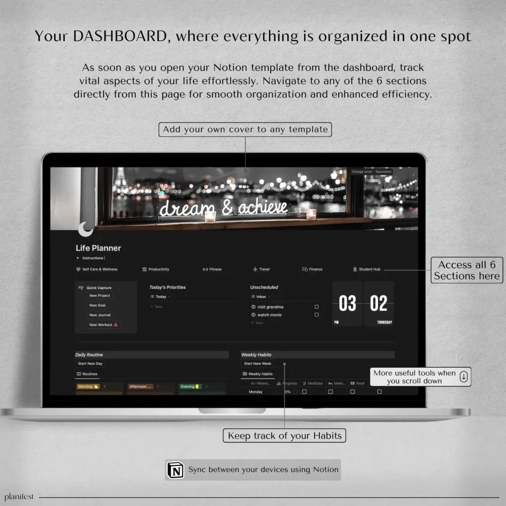 𝘚𝘪𝘮𝘱𝘭𝘪𝘧𝘺 𝘺𝘰𝘶𝘳 𝘭𝘪𝘧𝘦 𝘸𝘪𝘵𝘩 𝘰𝘶𝘳 𝘈𝘓𝘓-𝘐𝘕-𝘖𝘕𝘌 𝘕𝘖𝘛𝘐𝘖𝘕 𝘛𝘌𝘔𝘗𝘓𝘈𝘛𝘌 𝘧𝘰𝘳 𝘱𝘭𝘢𝘯𝘯𝘪𝘯𝘨, 𝘵𝘳𝘢𝘤𝘬𝘪𝘯𝘨, 𝘢𝘯𝘥 𝘰𝘳𝘨𝘢𝘯𝘪𝘻𝘪𝘯𝘨. 𝘚𝘦𝘢𝘮𝘭𝘦𝘴𝘴𝘭𝘺 𝘴𝘺𝘯𝘤 𝘺𝘰𝘶𝘳 𝘥𝘰𝘤𝘶𝘮𝘦𝘯𝘵𝘴 𝘢𝘤𝘳𝘰𝘴𝘴 𝘢𝘭𝘭 𝘥𝘦𝘷𝘪𝘤𝘦𝘴 𝘸𝘪𝘵𝘩 𝘵𝘩𝘦 𝘕𝘰𝘵𝘪𝘰𝘯 𝘈𝘱𝘱! 𝘌𝘯𝘫𝘰𝘺 𝘦𝘢𝘴𝘺 𝘳𝘦𝘢𝘥𝘢𝘣𝘪𝘭𝘪𝘵𝘺 𝘸𝘪𝘵𝘩 𝘰𝘶𝘳 𝘥𝘢𝘳𝘬 𝘮𝘰𝘥𝘦, 𝘥𝘦𝘴𝘪𝘨𝘯𝘦𝘥 𝘵𝘰 𝘣𝘦 𝘨𝘦𝘯𝘵𝘭𝘦 𝘰𝘯 𝘺𝘰𝘶𝘳 𝘦𝘺𝘦𝘴, 𝘰𝘳 𝘴𝘸𝘪𝘵𝘤𝘩 𝘵𝘰 𝘭𝘪𝘨𝘩𝘵 𝘮𝘰𝘥𝘦 𝘧𝘰𝘳 𝘢 𝘥𝘪𝘧𝘧𝘦𝘳𝘦𝘯𝘵 𝘷𝘪𝘣𝘦. 𝘞𝘪𝘵𝘩 6 𝘴𝘦𝘤𝘵𝘪𝘰𝘯𝘴 𝘢𝘯𝘥 𝘰𝘷𝘦𝘳 40 𝘵𝘦𝘮𝘱𝘭𝘢𝘵𝘦𝘴, 𝘪𝘵’𝘴 𝘺𝘰𝘶𝘳 𝘶𝘭𝘵𝘪𝘮𝘢𝘵𝘦 𝘴𝘰𝘭𝘶𝘵𝘪𝘰𝘯 𝘧𝘰𝘳 𝘴𝘵𝘳𝘦𝘢𝘮𝘭𝘪𝘯𝘪𝘯𝘨 𝘥𝘢𝘪𝘭𝘺 𝘳𝘰𝘶𝘵𝘪𝘯𝘦𝘴 𝘢𝘯𝘥 𝘦𝘯𝘩𝘢𝘯𝘤𝘪𝘯𝘨 𝘱𝘳𝘰𝘥𝘶𝘤𝘵𝘪𝘷𝘪𝘵𝘺. 𝘔𝘢𝘯𝘢𝘨𝘦 𝘴𝘦𝘭𝘧-𝘤𝘢𝘳𝘦 𝘢𝘯𝘥 𝘸𝘦𝘭𝘭𝘯𝘦𝘴𝘴, 𝘵𝘳𝘢𝘤𝘬 𝘧𝘪𝘯𝘢𝘯𝘤𝘦𝘴, 𝘴𝘦𝘵 𝘨𝘰𝘢𝘭𝘴, 𝘰𝘱𝘵𝘪𝘮𝘪𝘻𝘦 𝘧𝘪𝘵𝘯𝘦𝘴𝘴, 𝘱𝘭𝘢𝘯 𝘵𝘳𝘢𝘷𝘦𝘭, 𝘢𝘯𝘥 𝘴𝘵𝘢𝘺 𝘰𝘯 𝘵𝘰𝘱 𝘰𝘧 𝘴𝘤𝘩𝘰𝘰𝘭 𝘵𝘢𝘴𝘬𝘴—𝘢𝘭𝘭 𝘪𝘯 𝘰𝘯𝘦 𝘱𝘭𝘢𝘤𝘦.